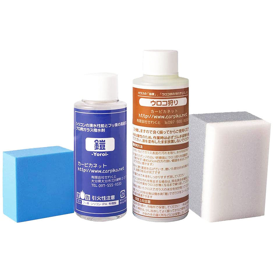 撥水コート剤が「鎧(よろい)」、撥水させるための下地処理アイテムが「ウロコ刈り」です。どちらもカーピカネットオリジナル用品です。